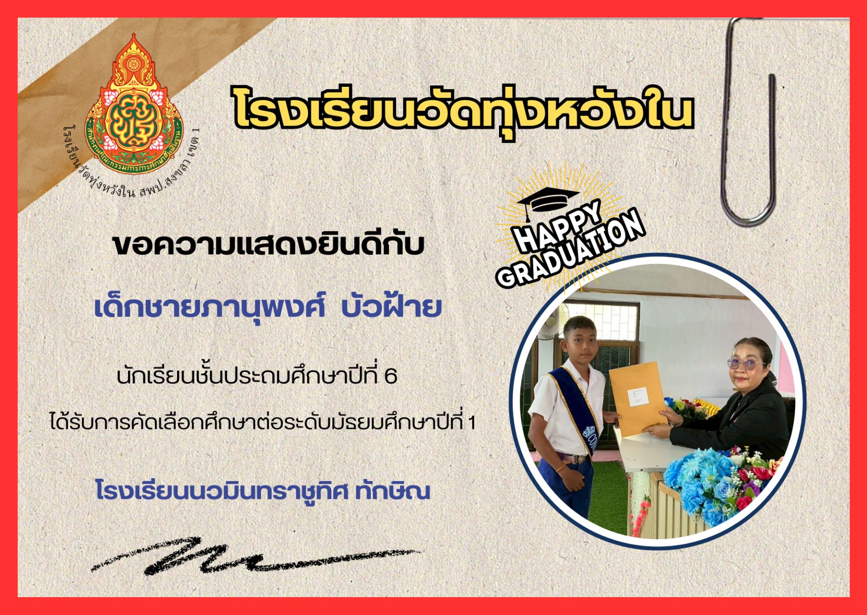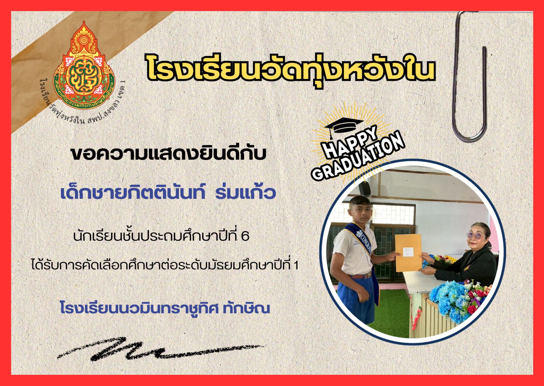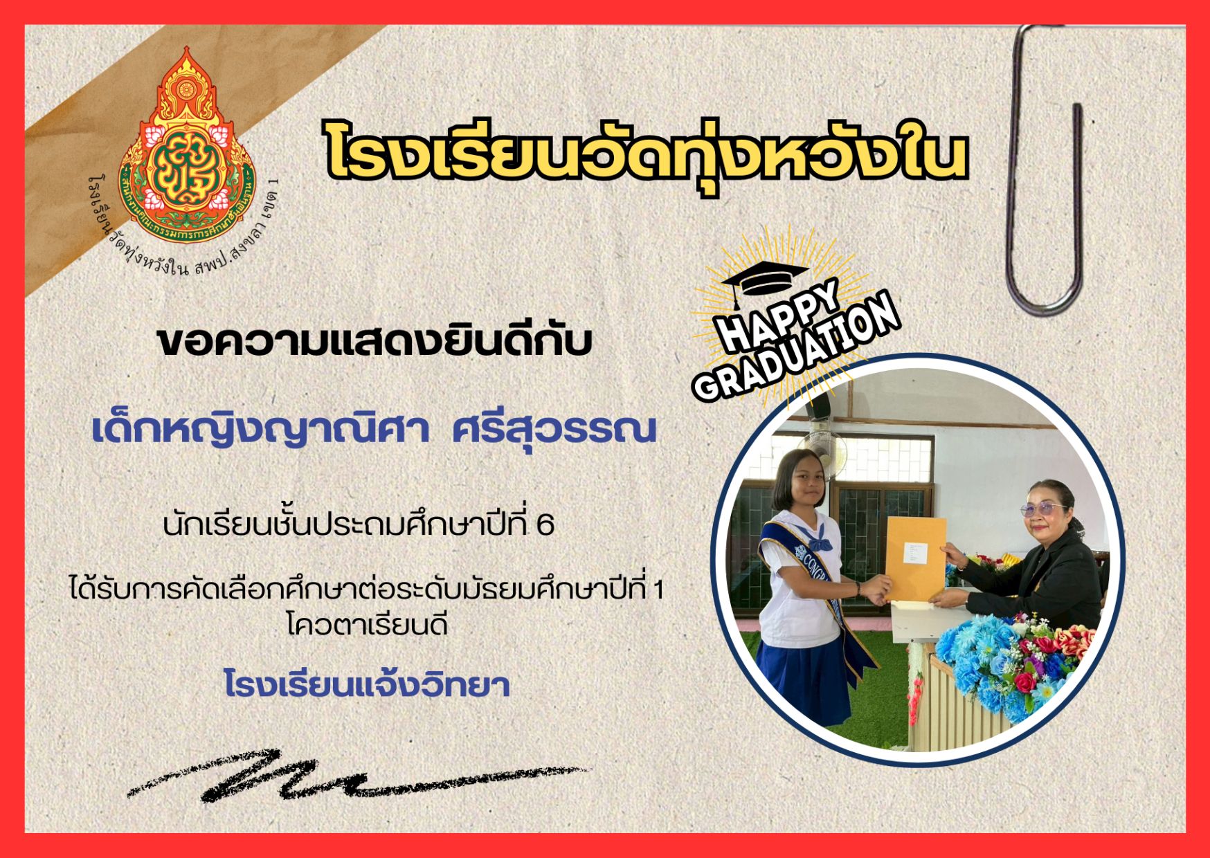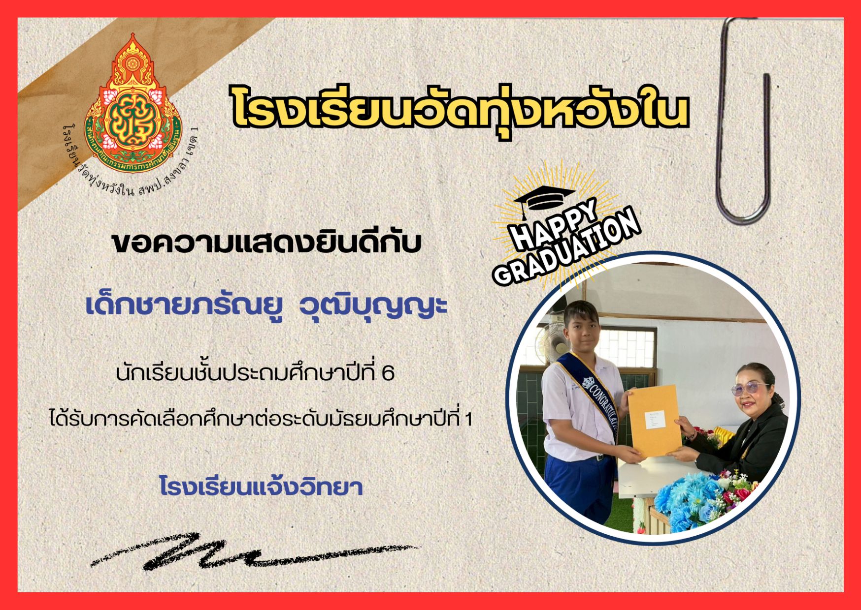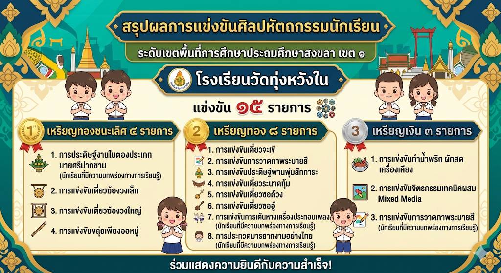 เมื่อวันที่ 13 กุมภาพันธ์ 2569 นางณิชาภัทร กาญจนพันธุ์ ผู้อำนวยการโรงเรียนวัดทุ่งหวังใน ได้มอบหมายให้คณะครูและบุคลากรทางการศึกษา นำนักเรียนเข้าร่วมการแข่งขันงานศิลปหัตถกรรมนักเรียน ครั้งที่ 73 ปีการศึกษา 2568 ระดับศูนย์เครือข่ายการศึกษา
