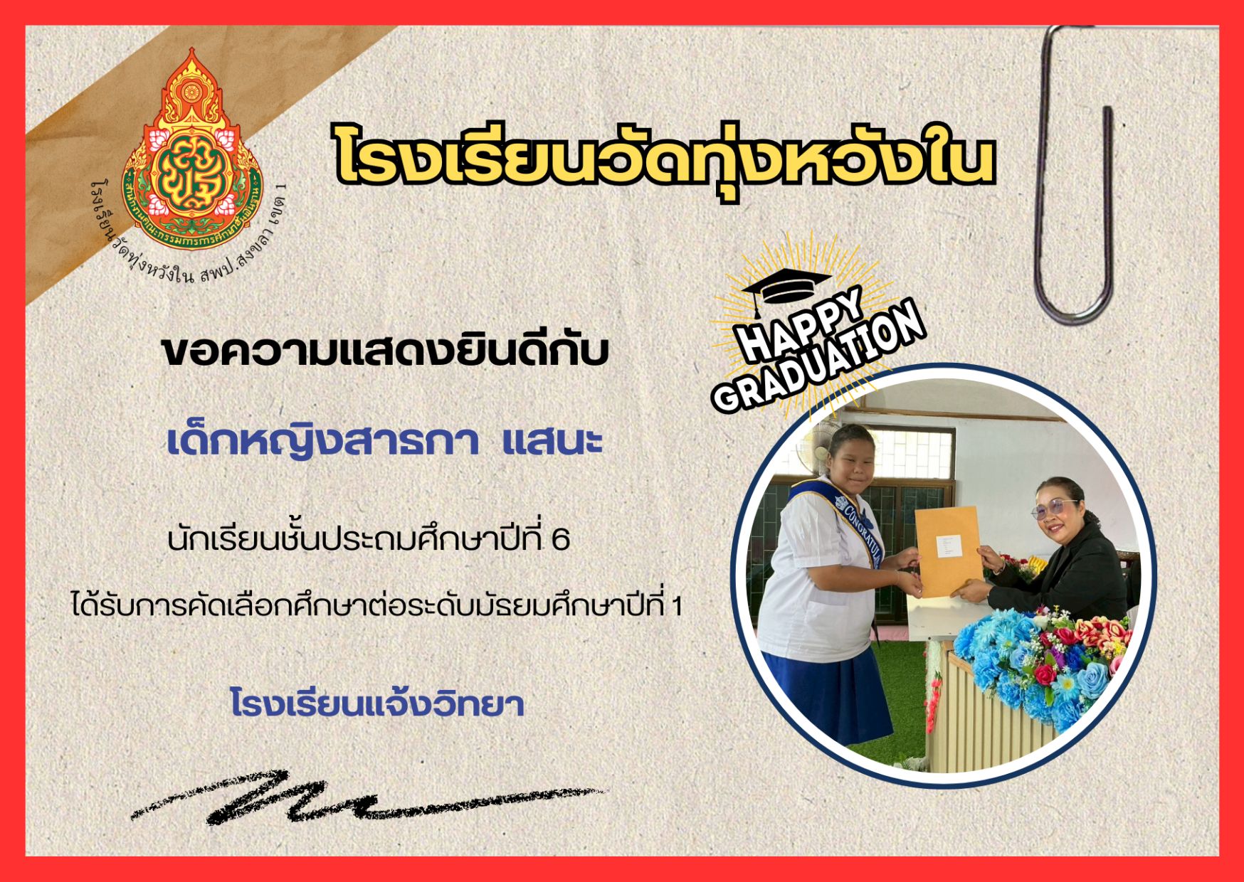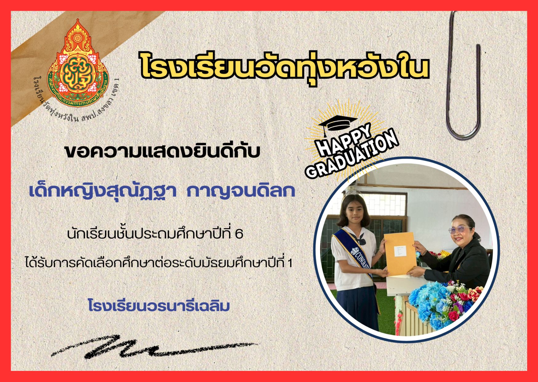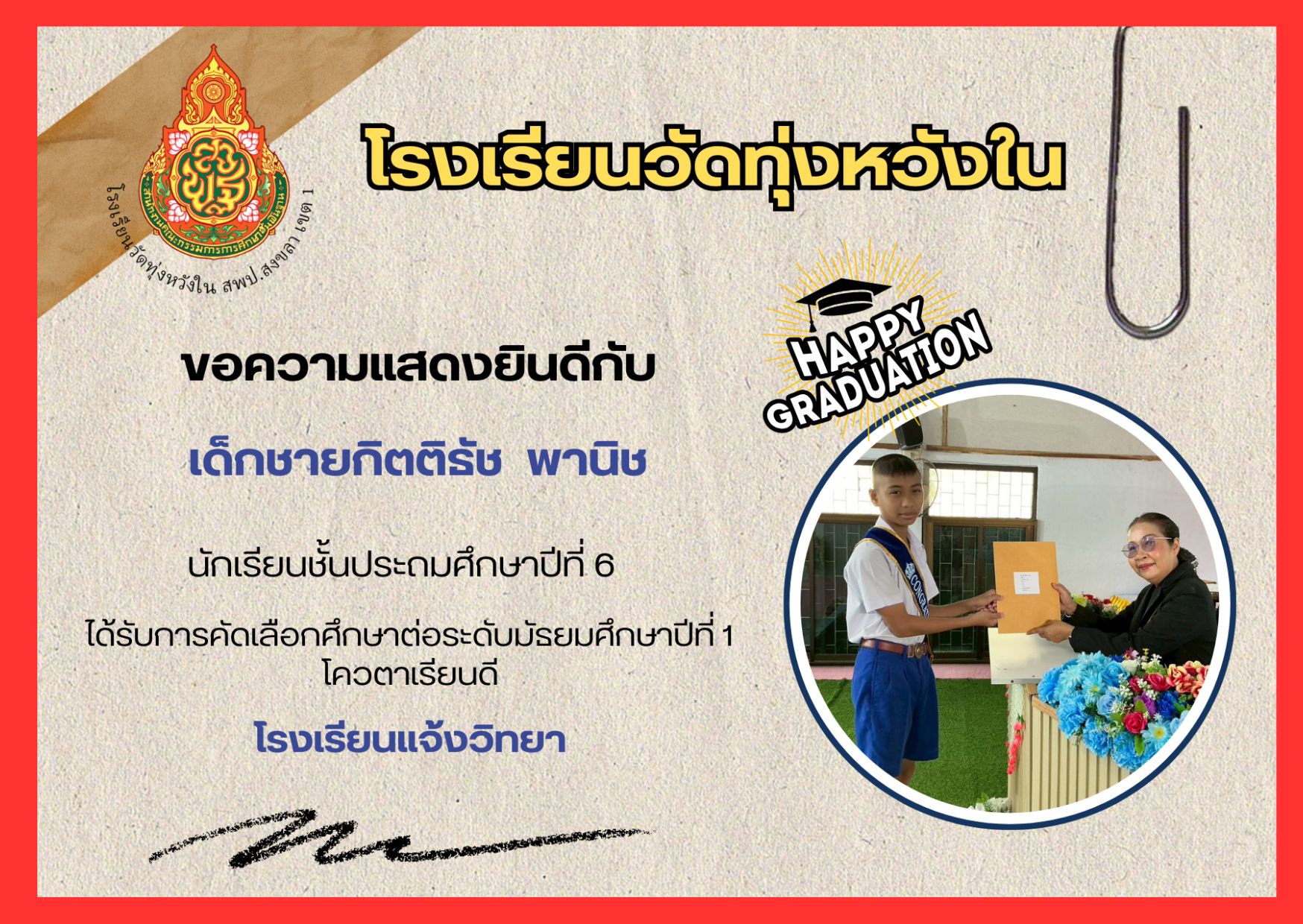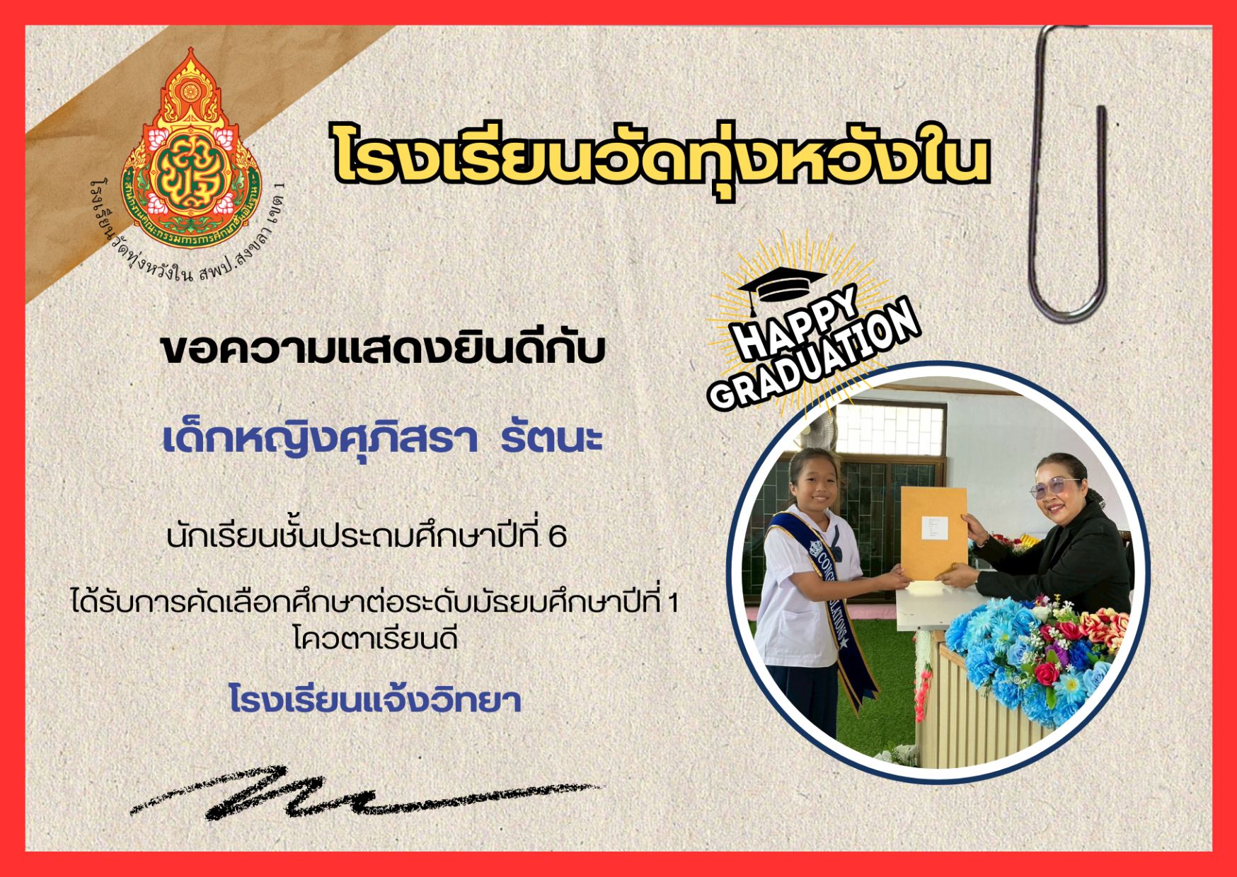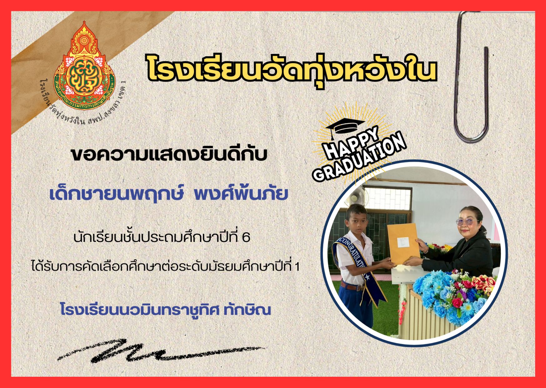 เมื่อวันที่ 13 กุมภาพันธ์ 2569 นางณิชาภัทร กาญจนพันธุ์ ผู้อำนวยการโรงเรียนวัดทุ่งหวังใน ได้มอบหมายให้คณะครูและบุคลากรทางการศึกษา นำนักเรียนเข้าร่วมการแข่งขันงานศิลปหัตถกรรมนักเรียน ครั้งที่ 73 ปีการศึกษา 2568 ระดับศูนย์เครือข่ายการศึกษา