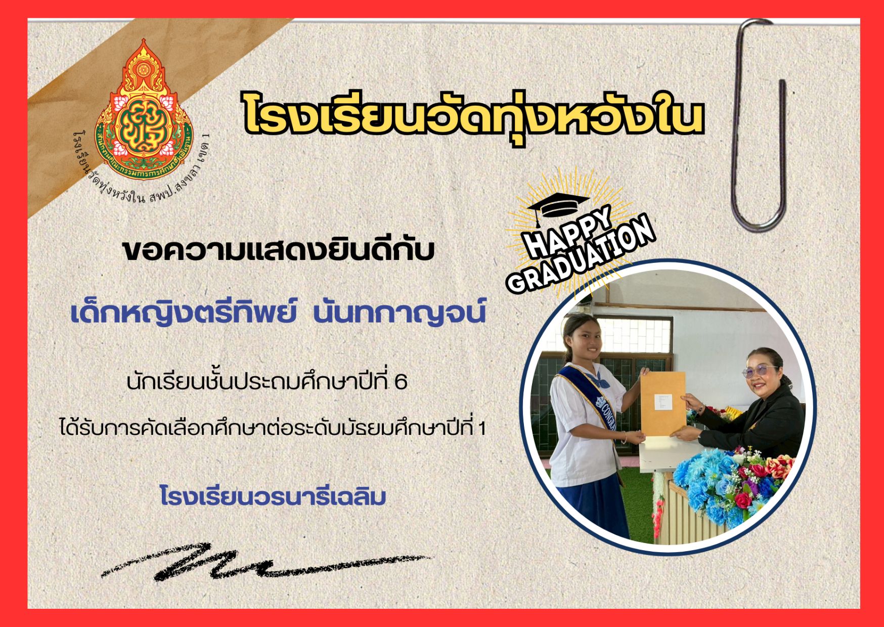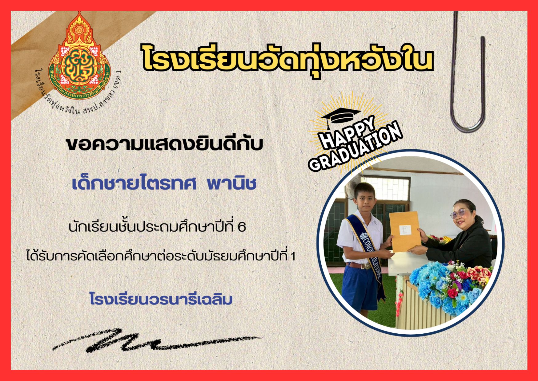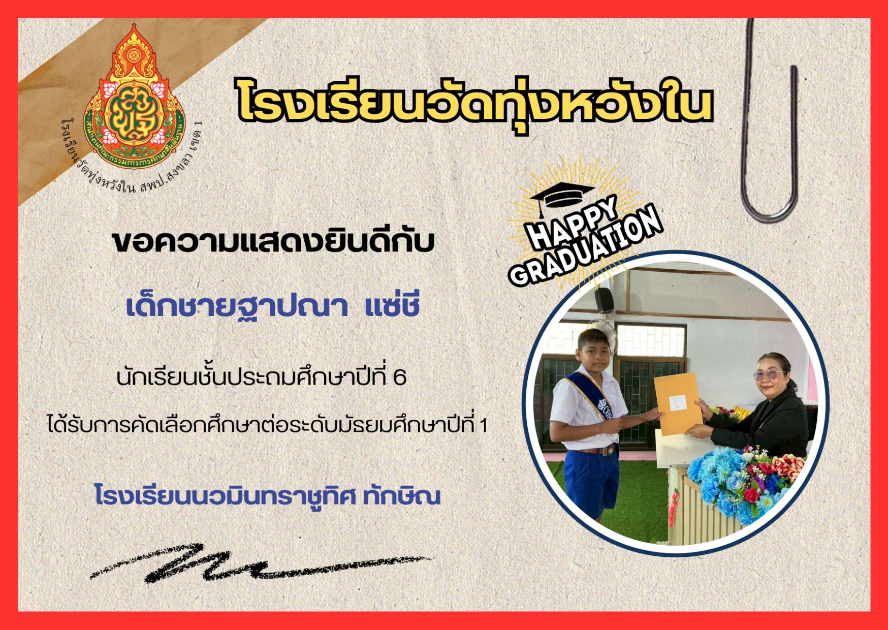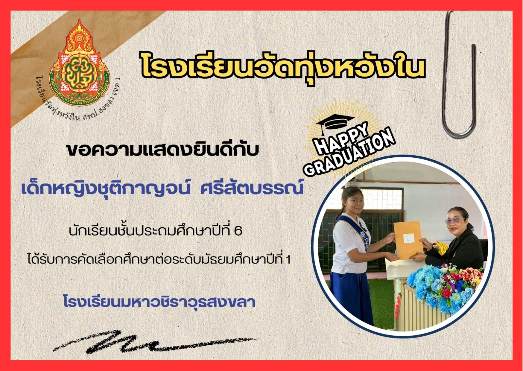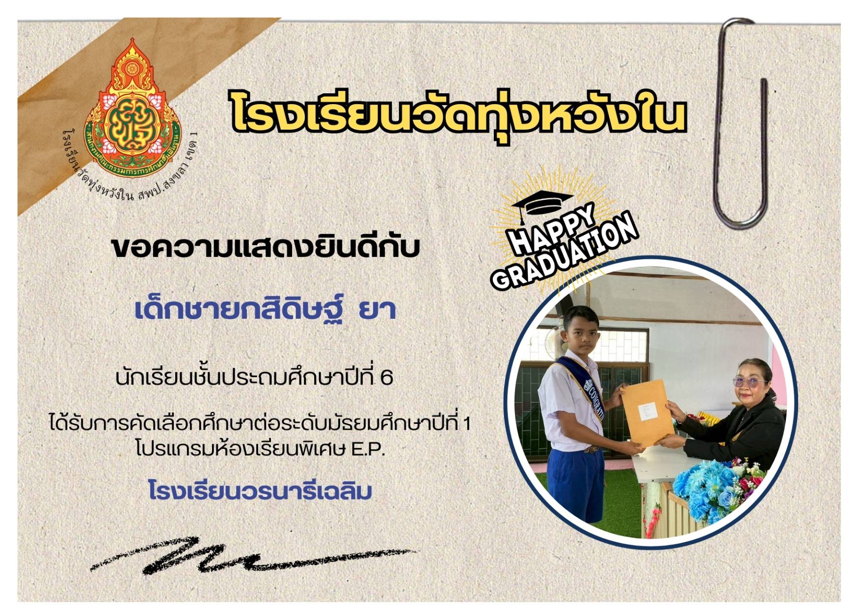 เมื่อวันที่ 13 กุมภาพันธ์ 2569 นางณิชาภัทร กาญจนพันธุ์ ผู้อำนวยการโรงเรียนวัดทุ่งหวังใน ได้มอบหมายให้คณะครูและบุคลากรทางการศึกษา นำนักเรียนเข้าร่วมการแข่งขันงานศิลปหัตถกรรมนักเรียน ครั้งที่ 73 ปีการศึกษา 2568 ระดับศูนย์เครือข่ายการศึกษา