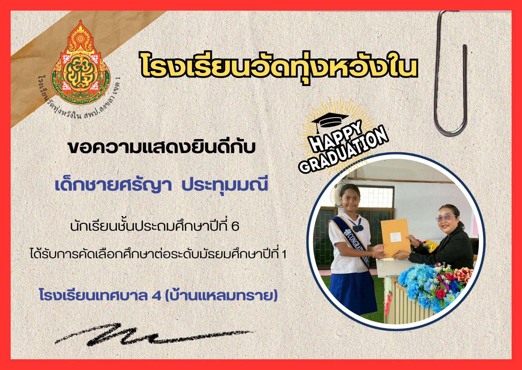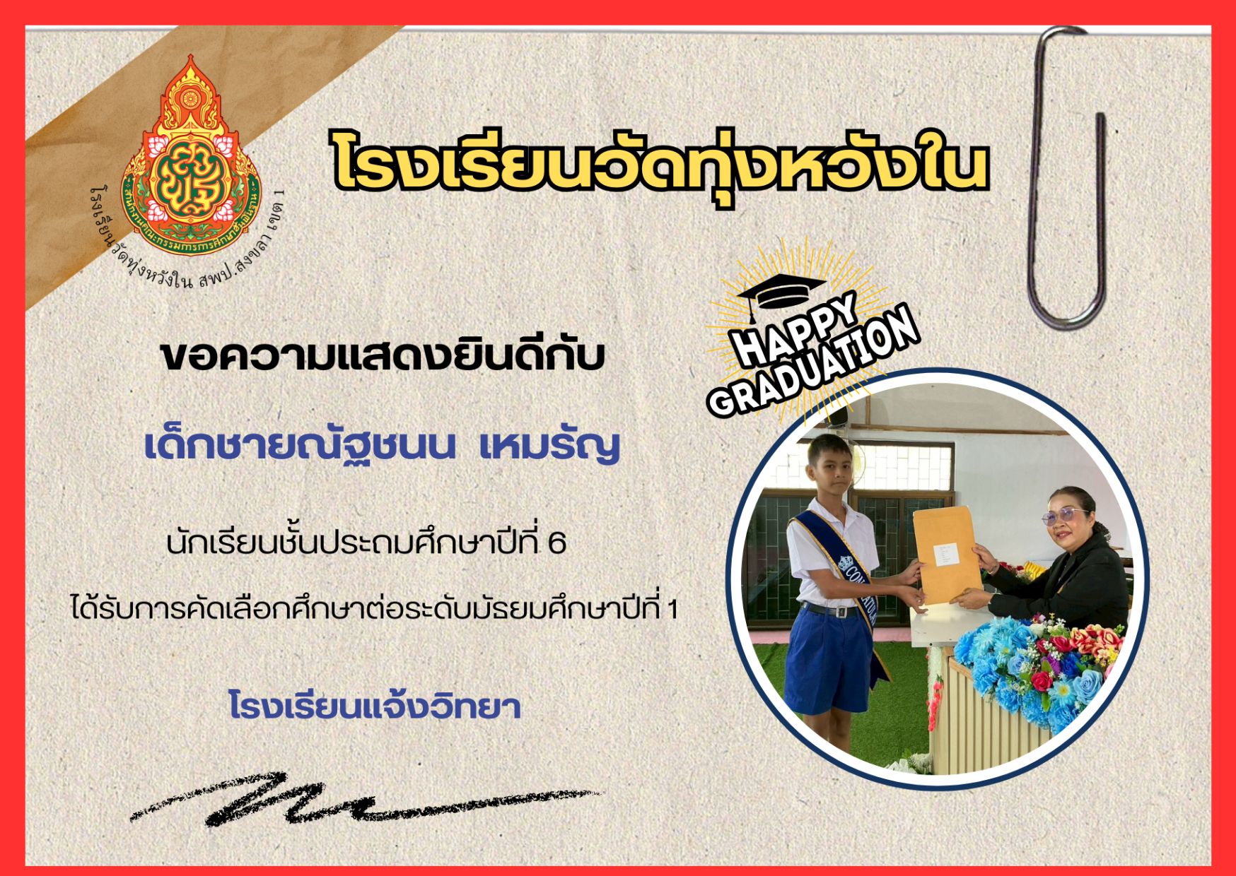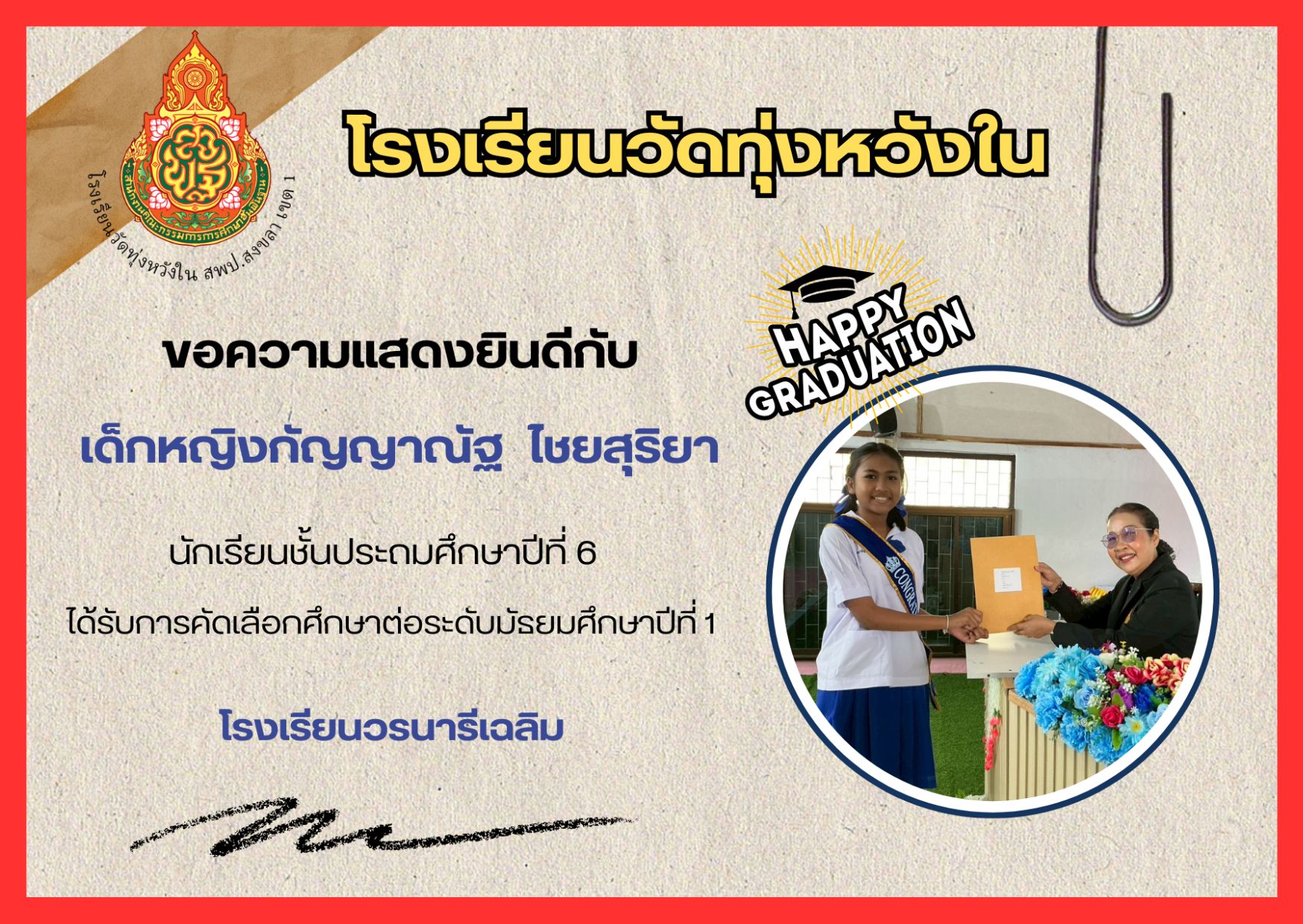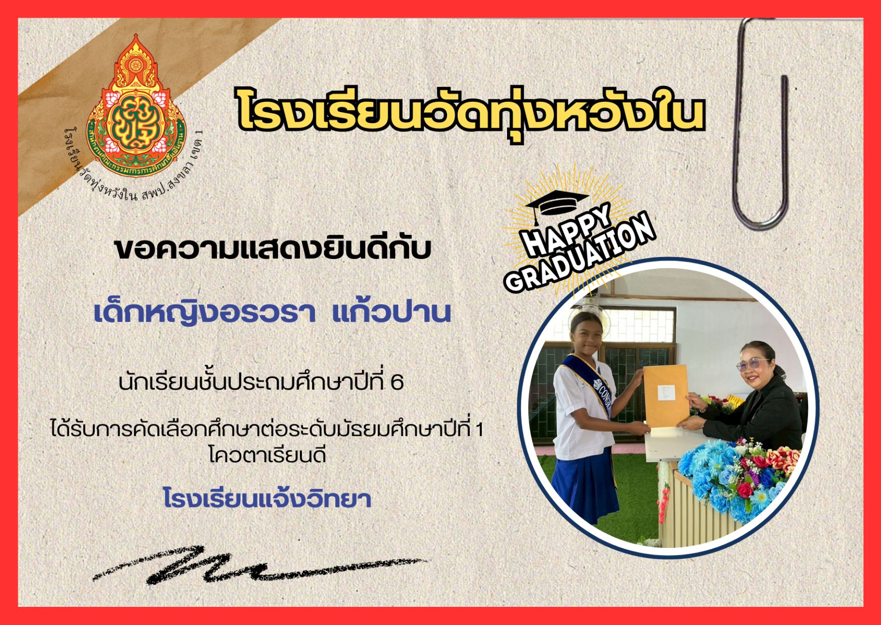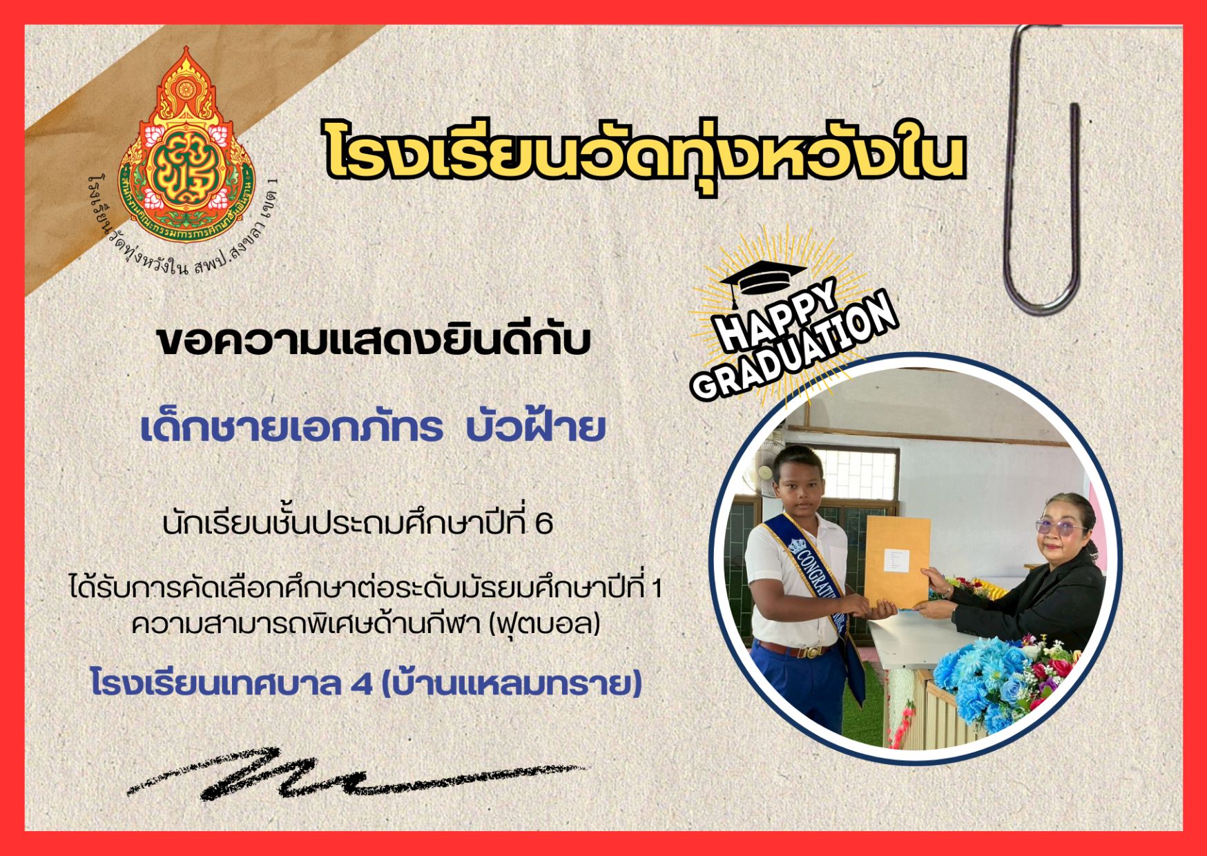 เมื่อวันที่ 13 กุมภาพันธ์ 2569 นางณิชาภัทร กาญจนพันธุ์ ผู้อำนวยการโรงเรียนวัดทุ่งหวังใน ได้มอบหมายให้คณะครูและบุคลากรทางการศึกษา นำนักเรียนเข้าร่วมการแข่งขันงานศิลปหัตถกรรมนักเรียน ครั้งที่ 73 ปีการศึกษา 2568 ระดับศูนย์เครือข่ายการศึกษา