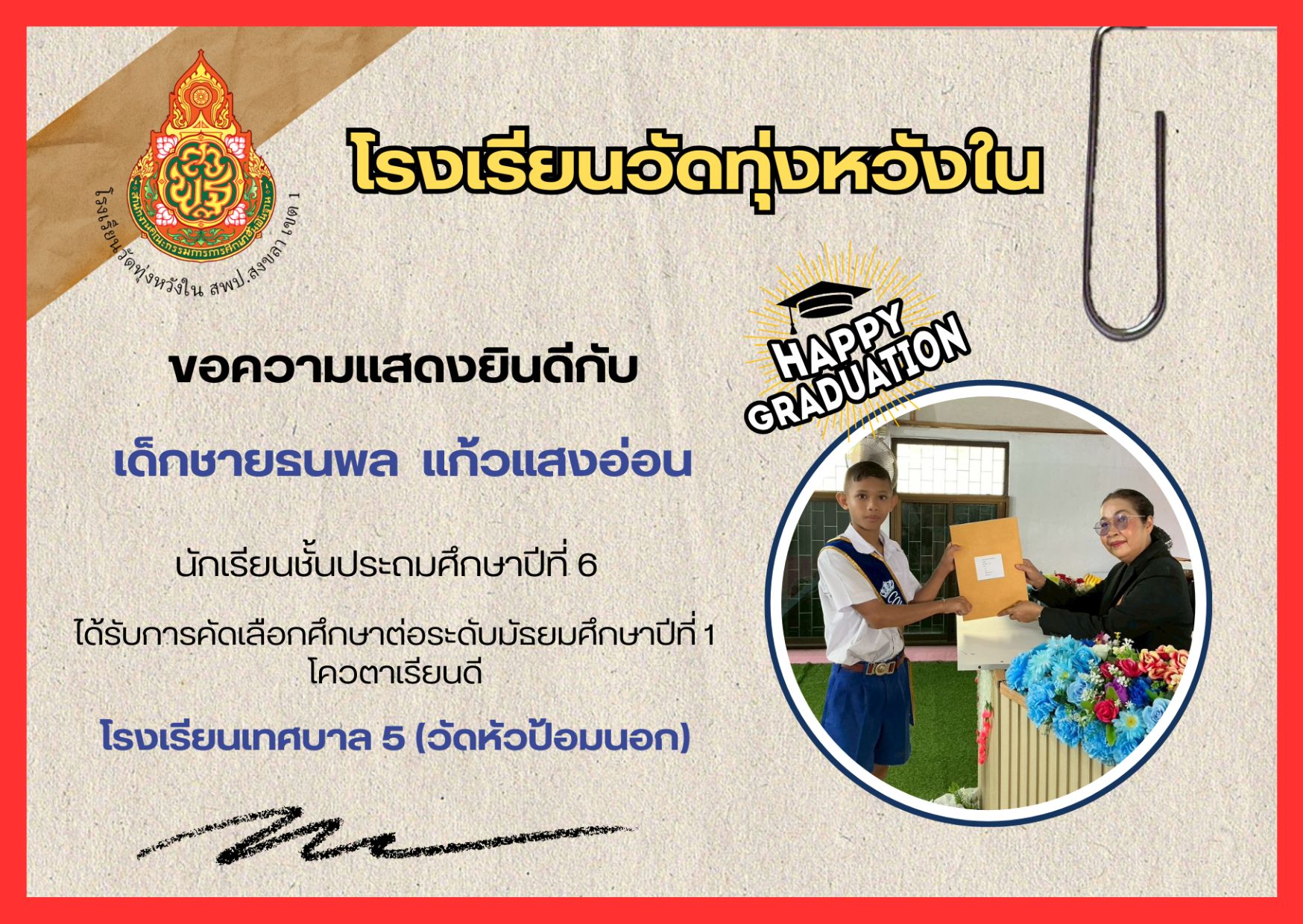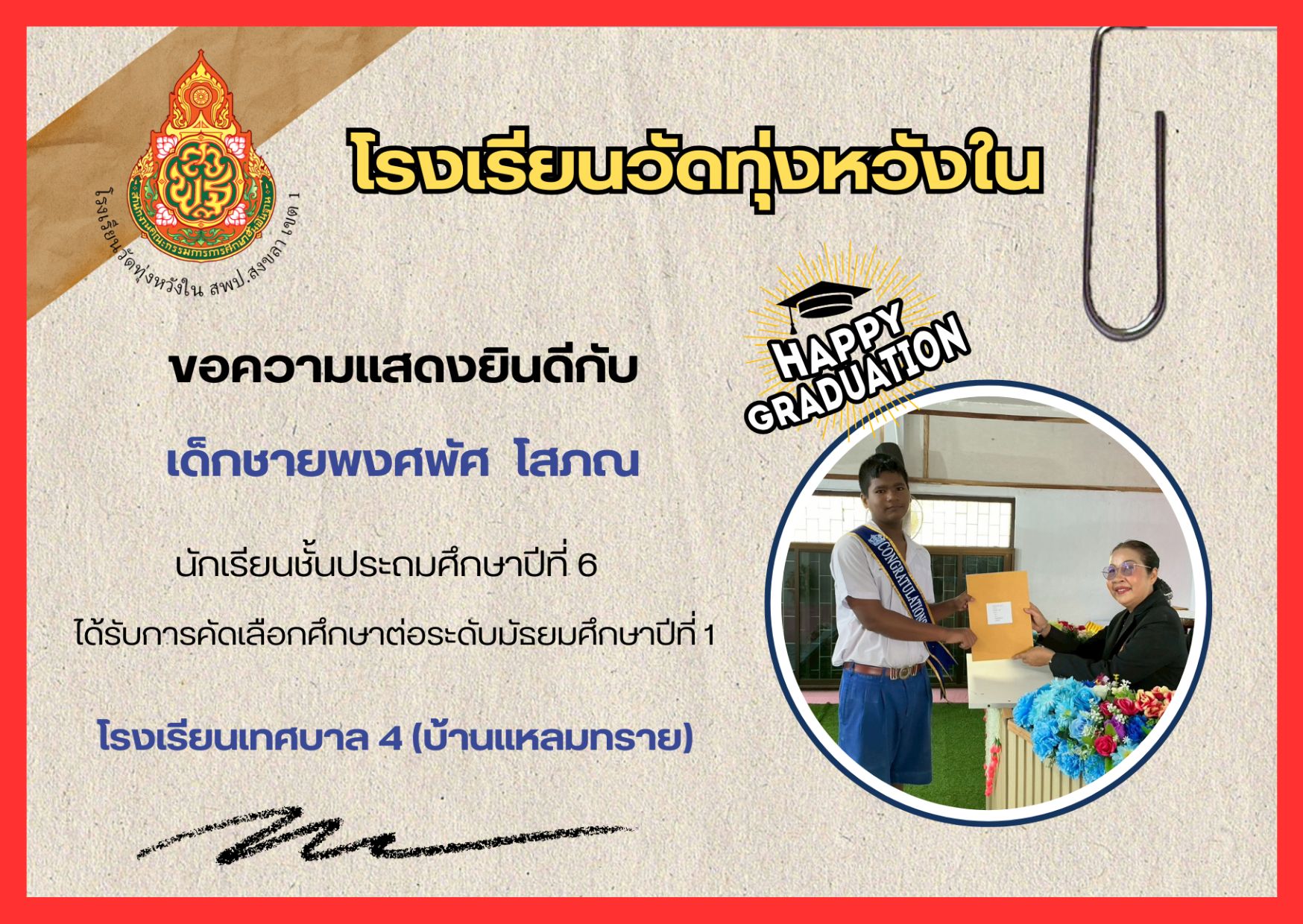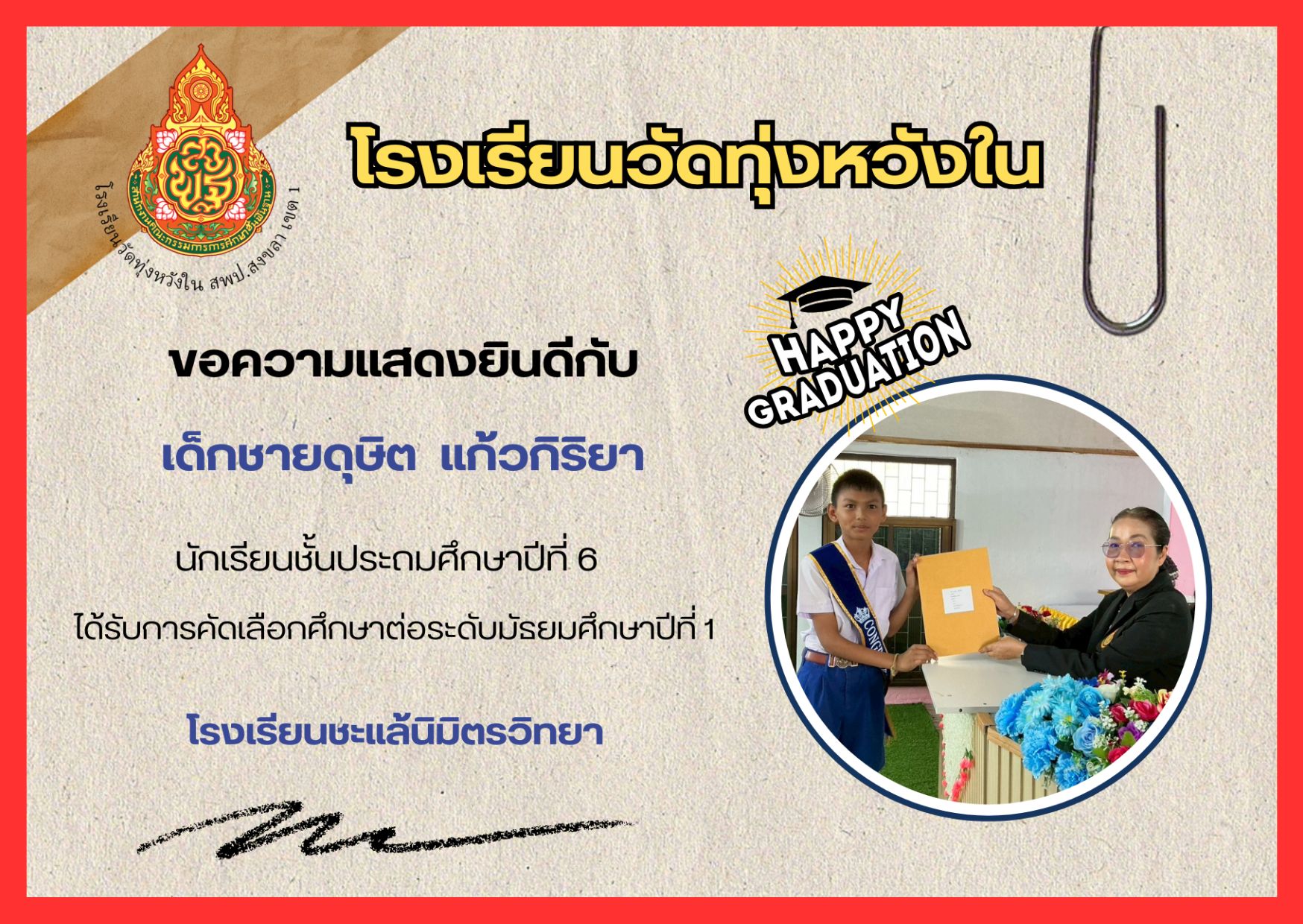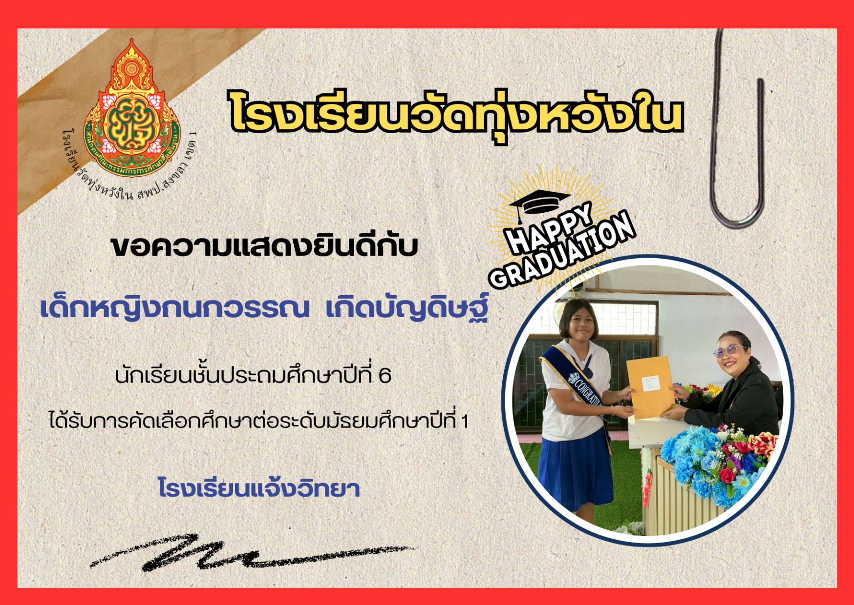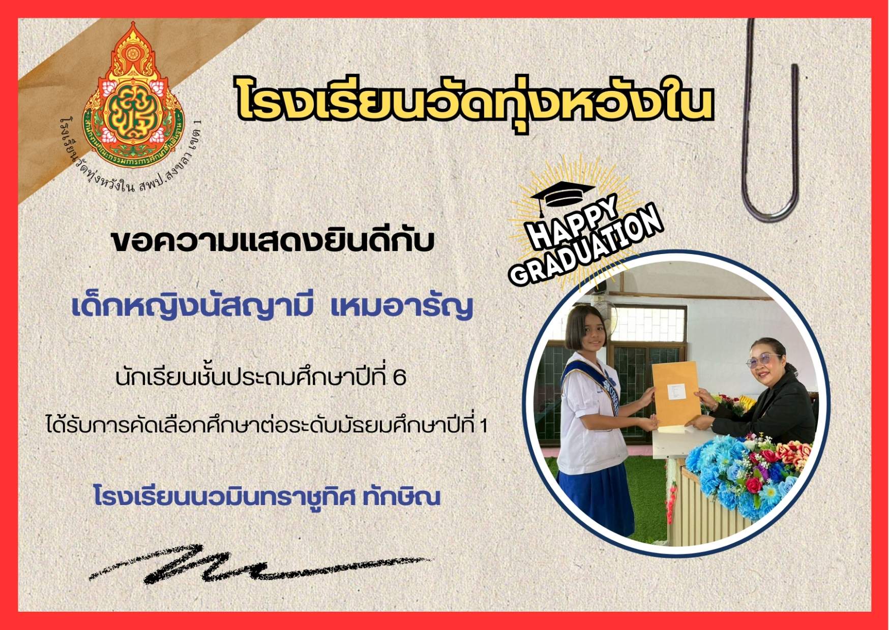 เมื่อวันที่ 13 กุมภาพันธ์ 2569 นางณิชาภัทร กาญจนพันธุ์ ผู้อำนวยการโรงเรียนวัดทุ่งหวังใน ได้มอบหมายให้คณะครูและบุคลากรทางการศึกษา นำนักเรียนเข้าร่วมการแข่งขันงานศิลปหัตถกรรมนักเรียน ครั้งที่ 73 ปีการศึกษา 2568 ระดับศูนย์เครือข่ายการศึกษา