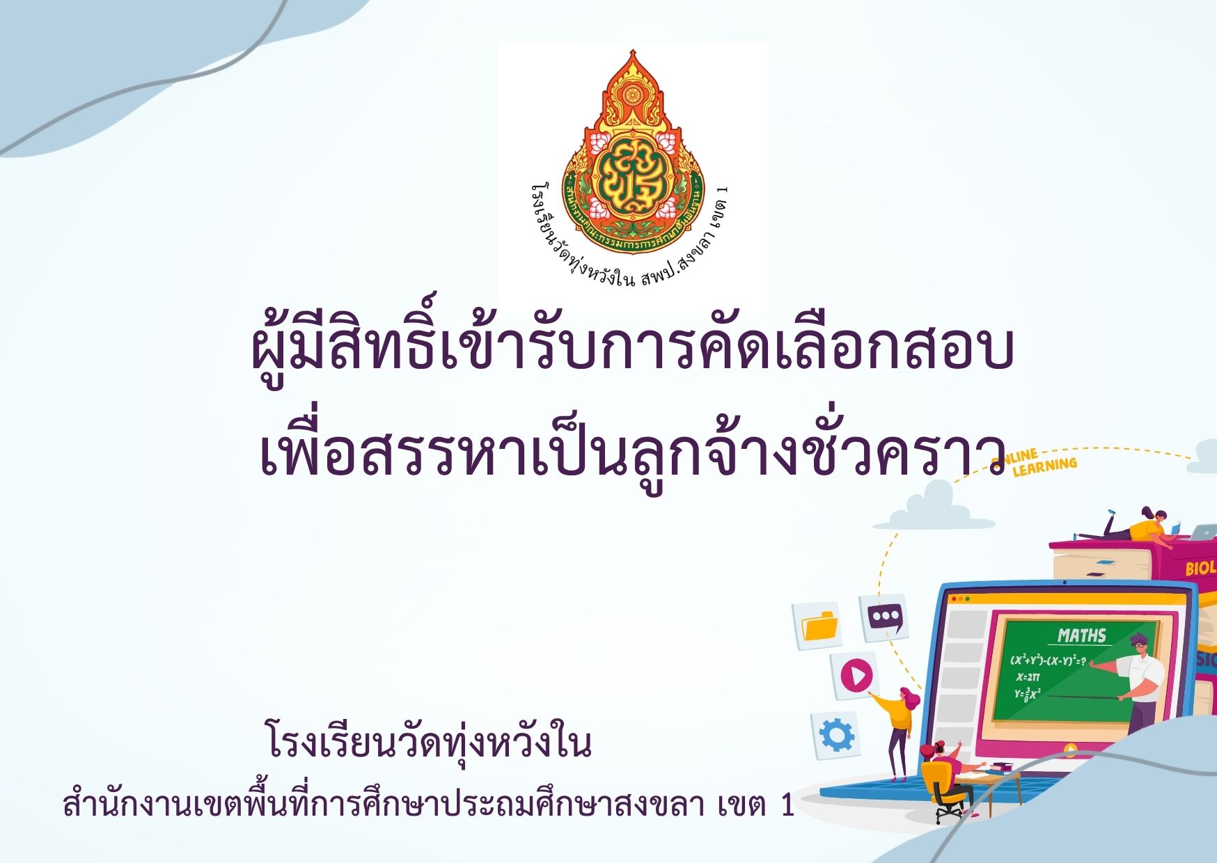 วันที่ 25 กุมภาพันธ์ 2569 นางณิชาภัทร กาญจนพันธุ์ ผู้อำนวยการโรงเรียนวัดทุ่งหวังใน หัวหน้าสนามสอบ ได้มอบหมายให้คุณครูที่ได้รับแต่งตั้งเป็นกรรมการคุมสอบ ดำเนินการทดสอบการประเมินคุณภาพผู้เรียนระดับชาติ NT ชั้นประถมศึกษาปีที่ 3 ปีการศึกษา 2568